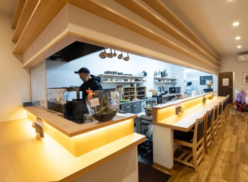 店内は、L字型カウンター席のみ。視線を厨房に集約し、ライブ感と会話を最大化。背面動線を広く確保して快適性を担保しました。カウンターの高さは、約70cmで長時間でも居心地良い滞在になるようにしています。