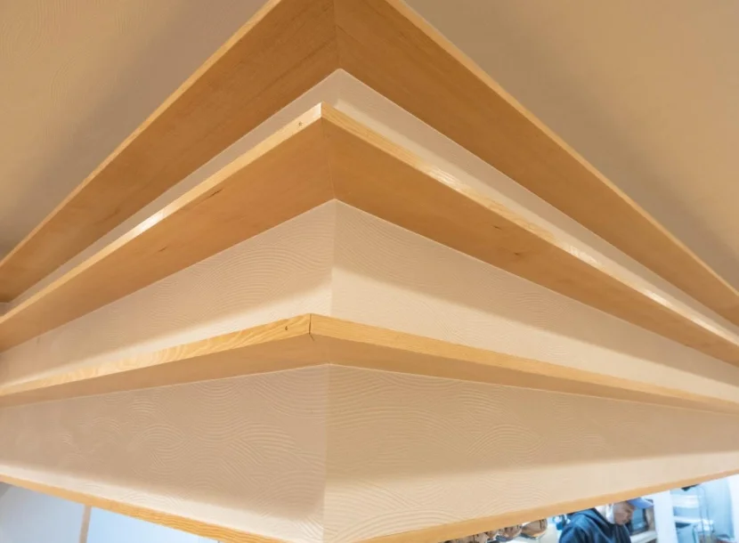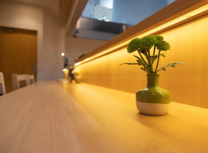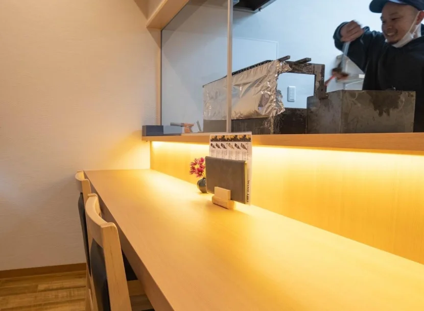 カウンター上部壁の木の直線意匠で陰影と奥行きを演出。カウンターの間接照明が手元と料理を上品に演出します。焼き台前には耐熱ガラスを設置し、紀州備長炭の火入れを“間近で・安全に”見せ、粋で素敵な体験を実現しました。