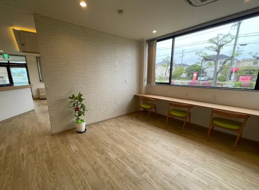 ロードサイドからの視認性を高めるため、縦型の自立サインとファサードの木目ラインで水平方向の広がりを強調しつつ、エントランスには大きな庇を設けて雨天時でも濡れにくいアプローチとしました。駐車場から出入り口までの動線は、車いすやベビーカーでもスムーズにアクセスできるよう、段差のないバリアフリー計画としています。