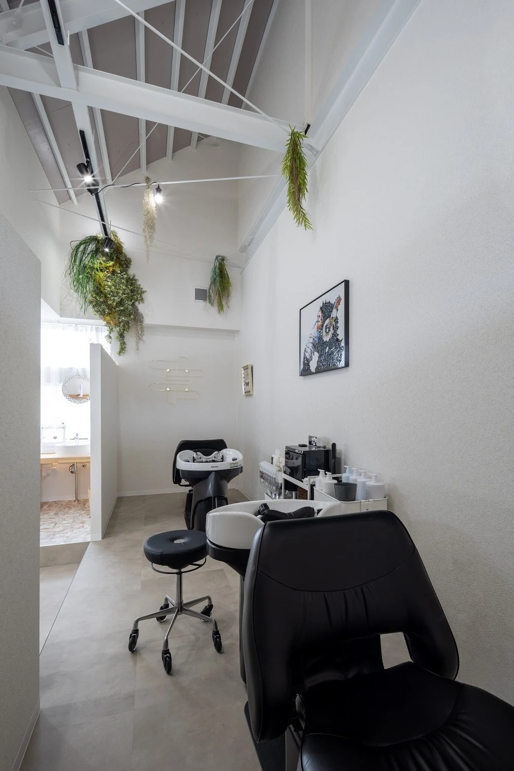 奥にはシャンプーブースを配置し、空間の抜け(天井の高さ感)と落ち着きが両立するゾーニングに。施術中に視線が散りにくいレイアウトで、リラックスできる時間を支えます。