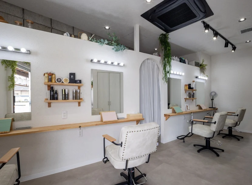 カットスペースは、すっきりとした壁面と木のカウンターラインで空間に水平のリズムをつくり、ミラーまわりは作業性と見え方のバランスを意識。天井から垂れるグリーンや、さりげない棚のディスプレイが“可愛さ”を足し、ナチュラルで居心地のよい雰囲気を演出しています。
